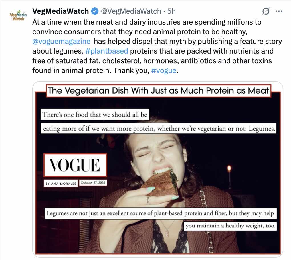 Vogue Magazine shines a spotlight on legumes, plant-based proteins and reports on why they’re healthier than animal protein. Please share, comment and/or like this @VegMediaWatch post on X, Instagram, Facebook, Threads and LinkedIn.