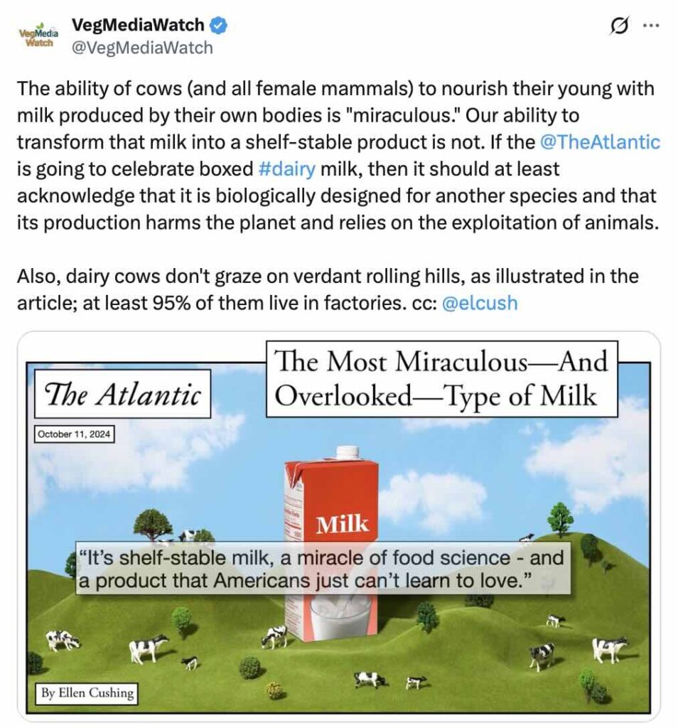 The Atlantic celebrates the technology behind “shelf-stable” dairy milk without reporting on the toll dairy production takes on human health, the planet, the cows and their newborn calves. Please help VegMediaWatch call out the lack of fair balance by sharing and/or commenting on the following social media posts: Instagram, LinkedIn, X, Facebook, Threads, Bluesky.