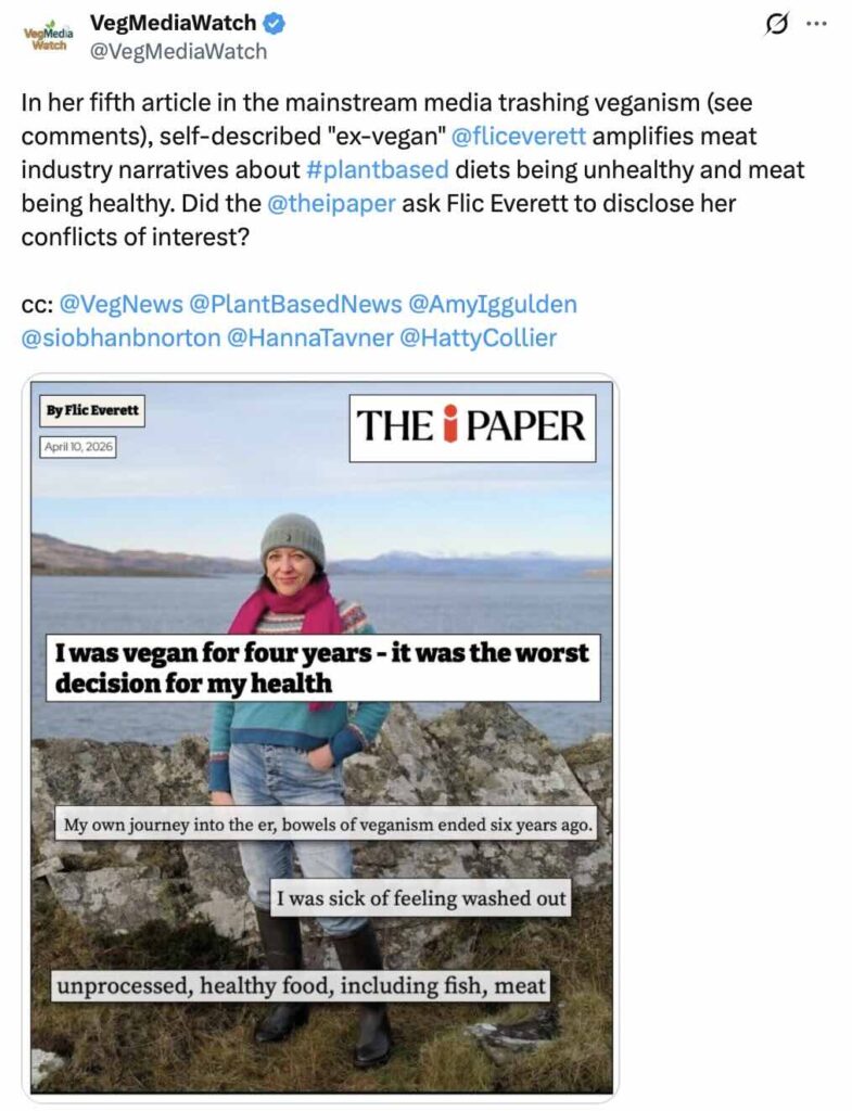 The i-Paper, a British newspaper, platformed a self-described ex-vegan who routinely vilifies veganism and promotes meat in the mainstream media. Please help VegMediaWatch call on the i-Paper to disclose Flic Everett’s conflicts of interest by sharing and/or commenting on the following social media posts: Instagram, LinkedIn, X, Facebook, Threads, Bluesky.