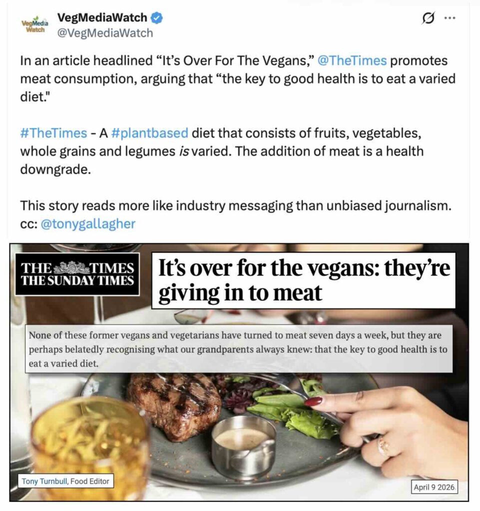 The Times, a prominent U.K.-based newspaper, parrots meat industry propaganda about the health benefits of meat and the end of veganism. Please help VegMediaWatch call out the anti-vegan bias by sharing and/or commenting on the following social media posts: Instagram, LinkedIn, X, Facebook, Threads, Bluesky.