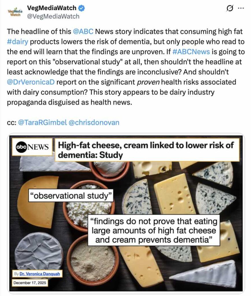 ABC News reports that consuming high fat dairy products lowers the risk of dementia, but only people who read to the end will learn that the findings are unproven. Instagram, Facebook, X, Threads, Bluesky, LinkedIn