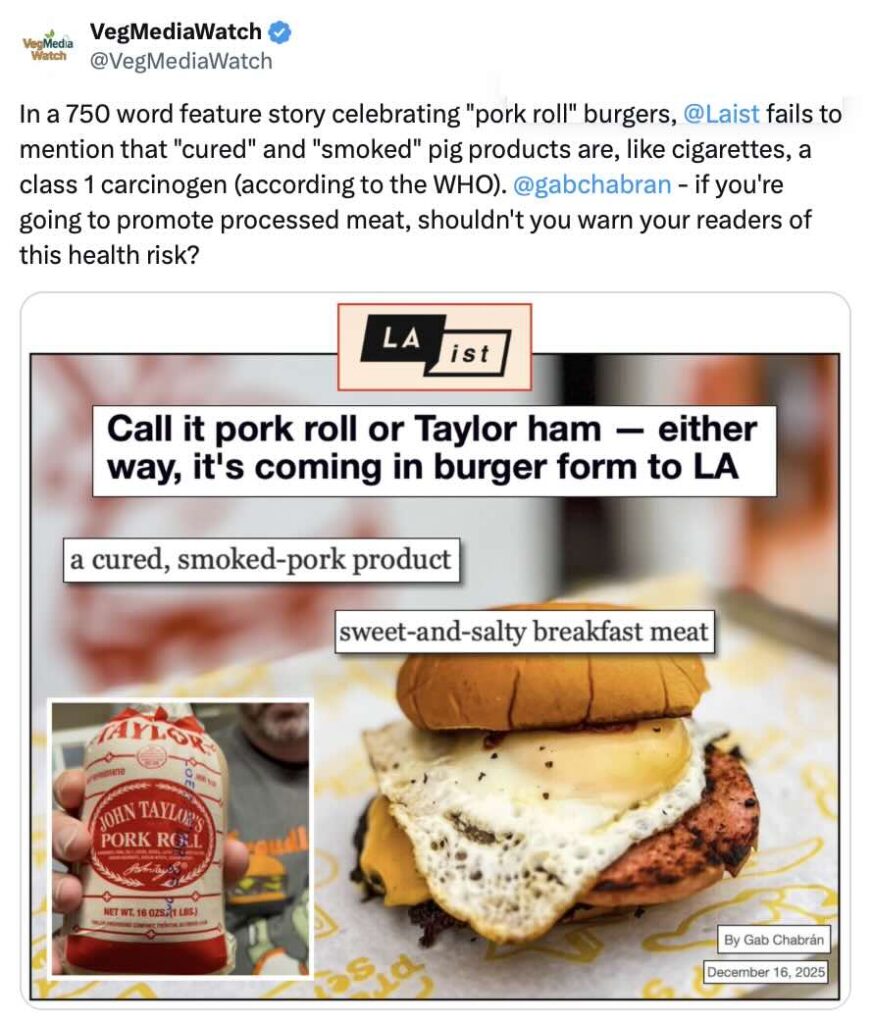 LAist celebrates “pork roll” burgers without reporting that processed meats are a class one carcinogen. Instagram, Facebook, X, Threads, Bluesky, LinkedIn