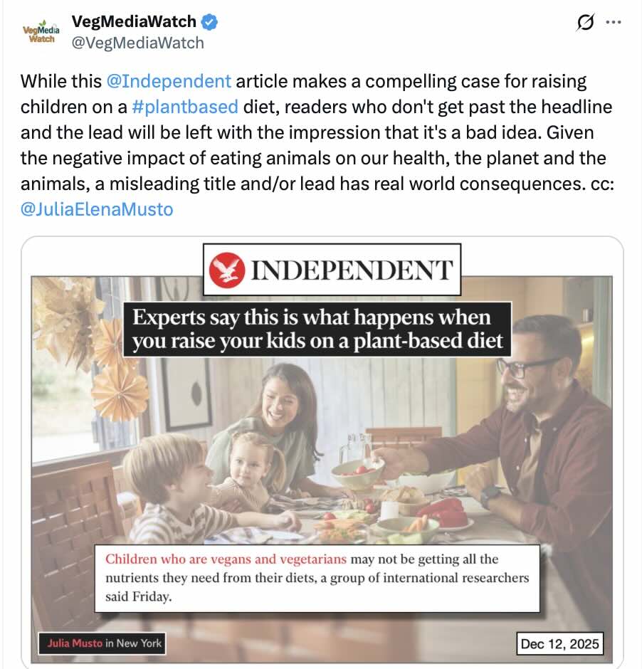 The Independent leads with an assertion that gives readers the impression that a plant-based diet is suboptimal for children: Instagram, Facebook, X, Threads, Bluesky, LinkedIn