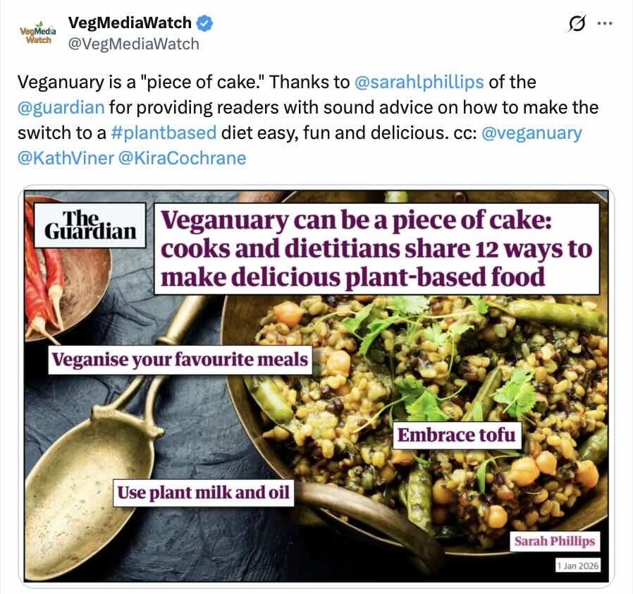 The Guardian celebrates Veganuary by providing readers with tips on making the switch to a plant-based diet. Please help VegMediaWatch thank the journalist and editors at the Guardian by re-posting and/or commenting on the VegMediaWatch posts: LinkedIn, X, Threads, Bluesky, Instagram, Facebook