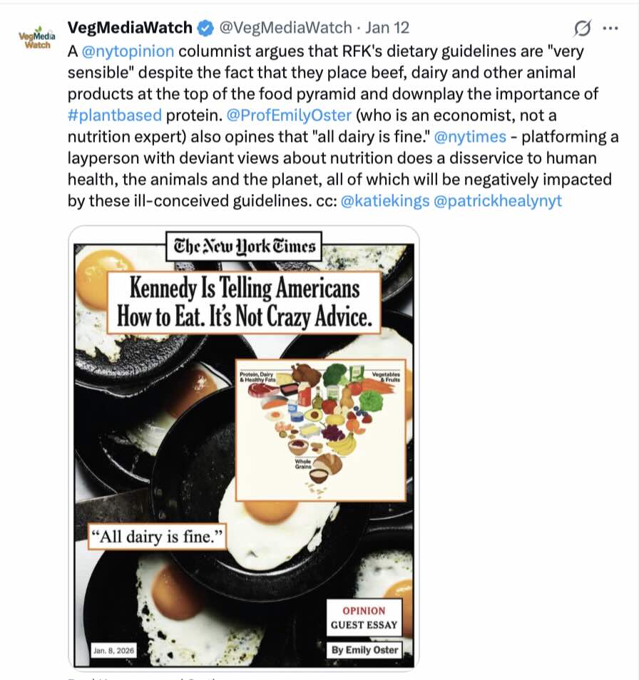 The NY Times platforms a layperson who opines that RFK’s dietary guidelines, which place meat and dairy at the top of the food pyramid, are “very sensible.” Please help VegMediaWatch hold the NY Times accountable for its reckless decision by re-posting and/or commenting on the VegMediaWatch posts: LinkedIn, X, Threads, Bluesky, Instagram, Facebook