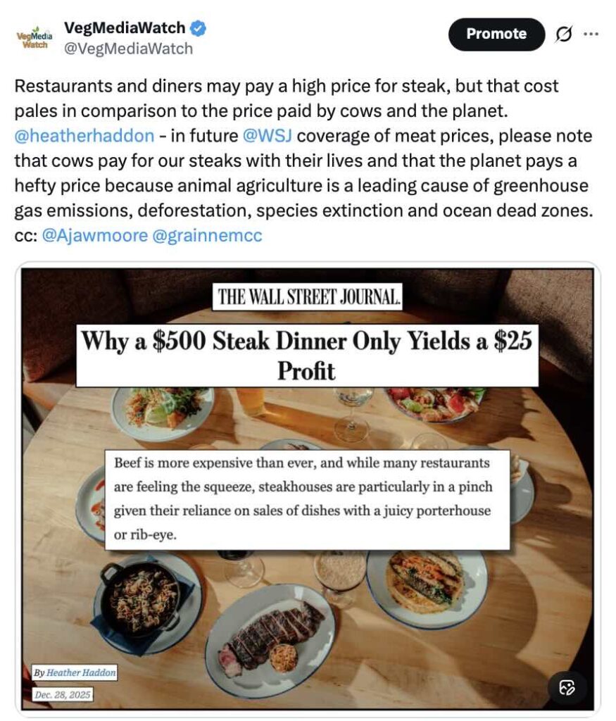 In its coverage of high steak prices, the Wall Street Journal fails to even mention the high cost to the cows and the planet. Please help VegMediaWatch hold the WSJ accountable for this glaring omission by re-posting and/or commenting on the VegMediaWatch posts: LinkedIn, X, Threads, Bluesky, Instagram, Facebook